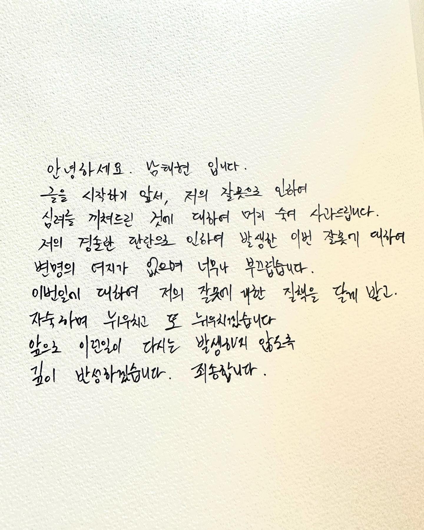 여론이 싸늘한 가운데 남태현 본인도 자필 편지로 사과했습니다. 그는 자신의 SNS에 "안녕하세요. 남태현입니다"라면서 "글을 시작하기 앞서, 저의 잘못으로 인하여 심려를 끼쳐드린 것에 대하여 머리 숙여 사과드립니다"라고 사과했습니다. 이어 "저의 경솔한 판단으로 인하여 발생한 이번 잘못에 대하여 변명의 여지가 없으며 너무나 부끄럽습니다. 이번 일에 대하여 저의 잘못에 대한 질책을 달게 받고 자숙하며 뉘우치고 또 뉘우치겠습니다. 앞으로 이런 일이 다시는 발생하지 않도록 깊이 반성하겠습니다. 죄송합니다"라고 적었습니다.